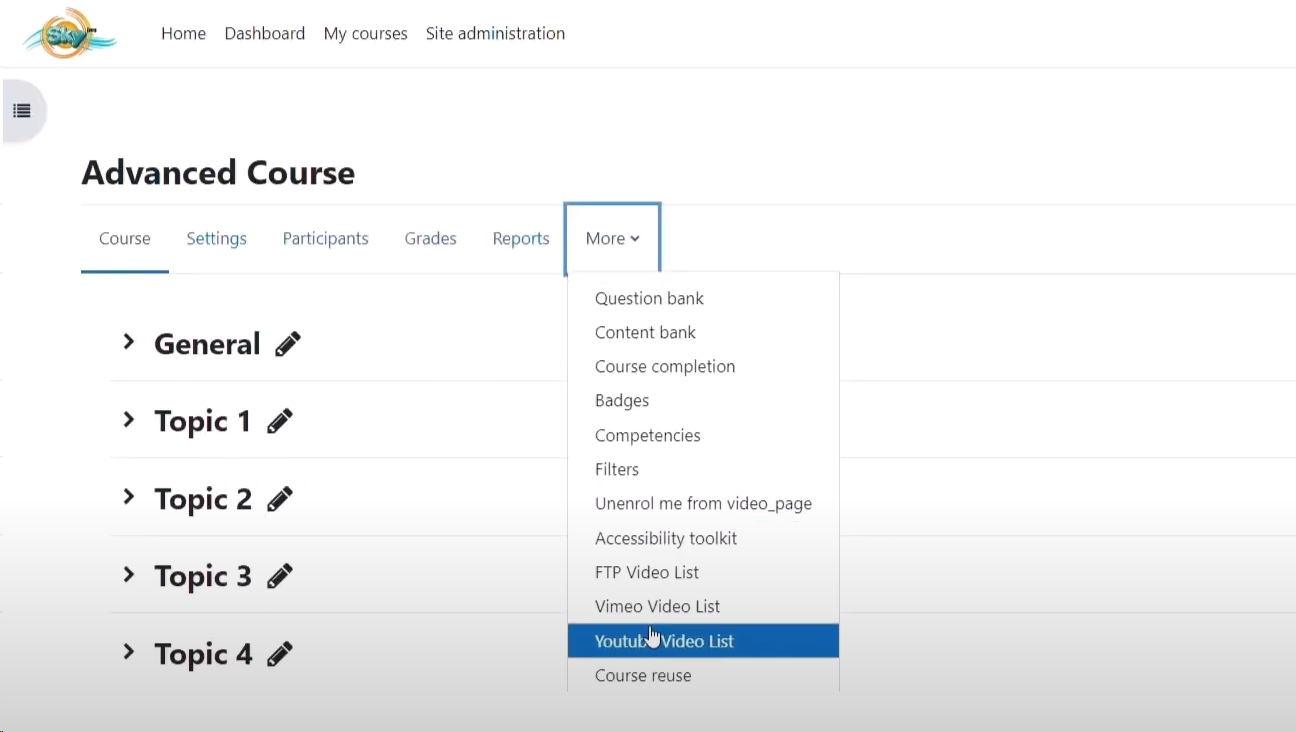 * Navigate to your Moodle course, click "more" on the top course menu, and select "YouTube video list" from the drop-down.